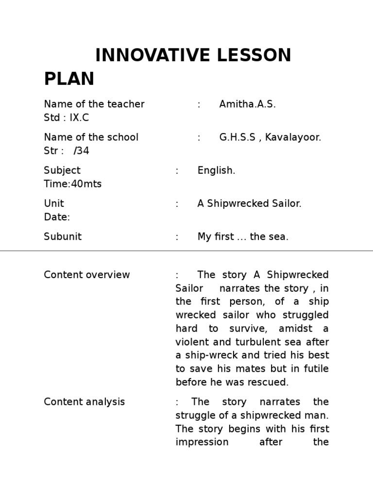 Innovative Lesson Plan A Shipwrecked Sailor